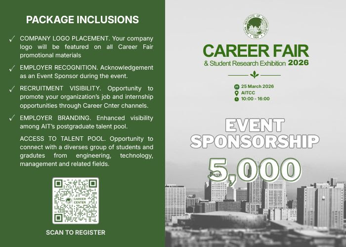 The Asian Institute of Technology, an international English-speaking postgraduate institution, focusing on engineering, environment, and management studies, is pleased to invite your esteemed organization to participate in the AIT Career Fair 2026, to be held on Wednesday, 25 March 2026, at the AIT Pathumthani Campus, Conference Center.